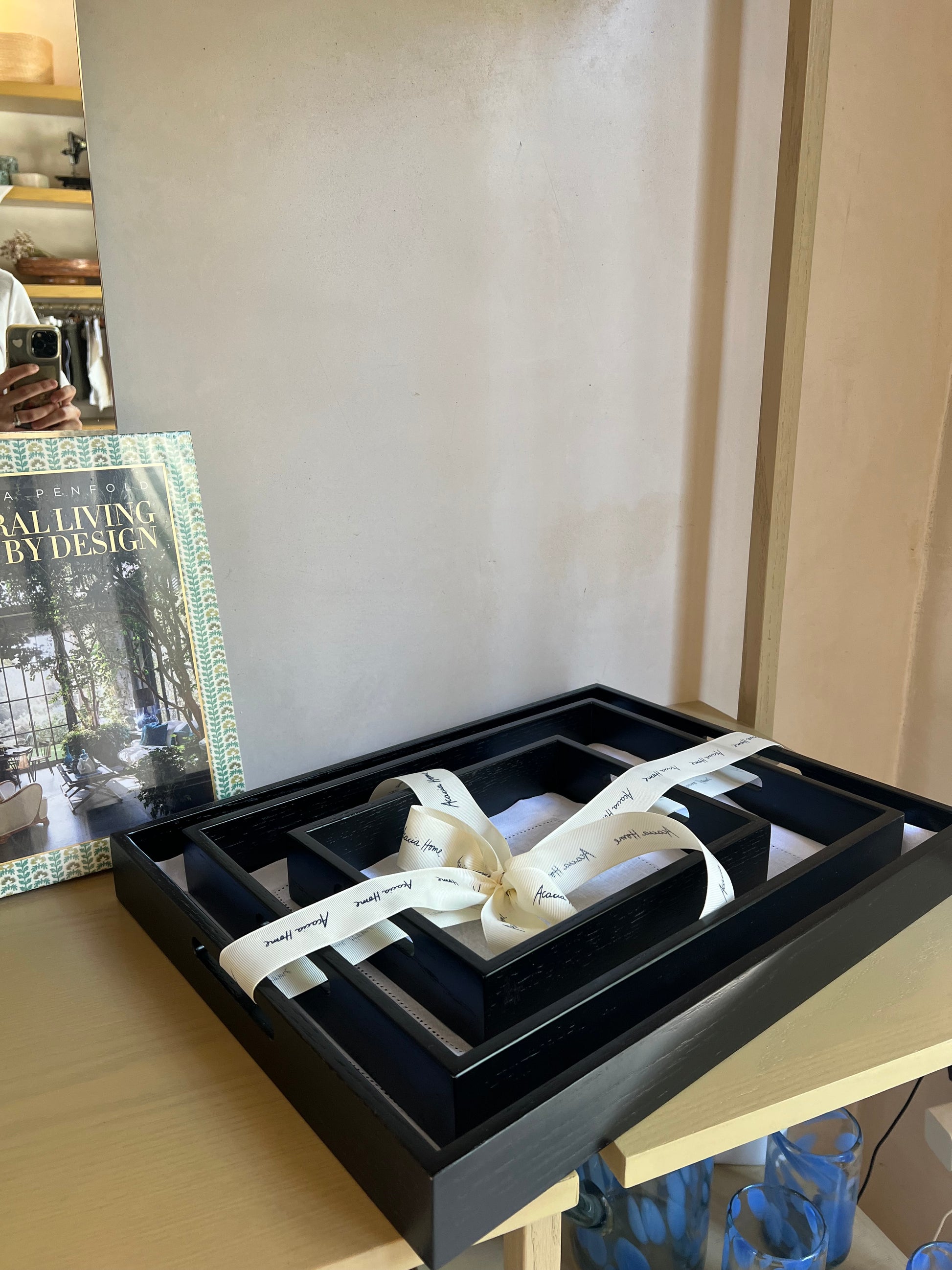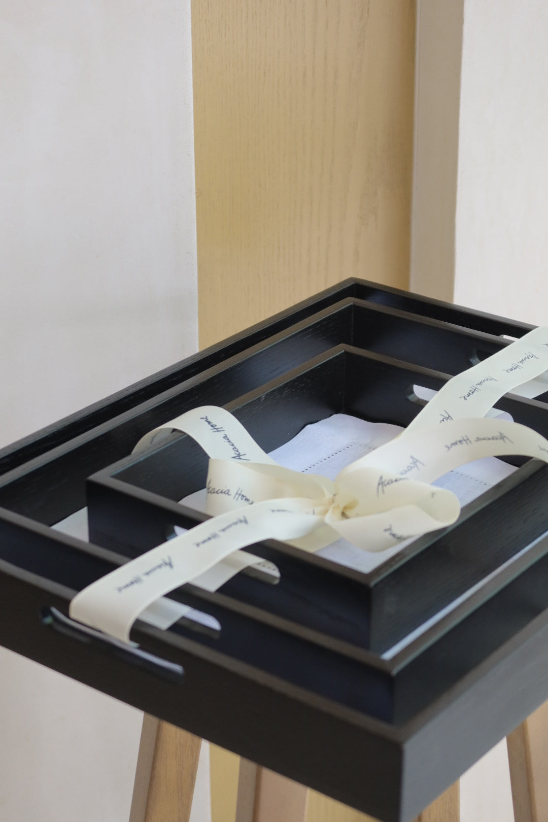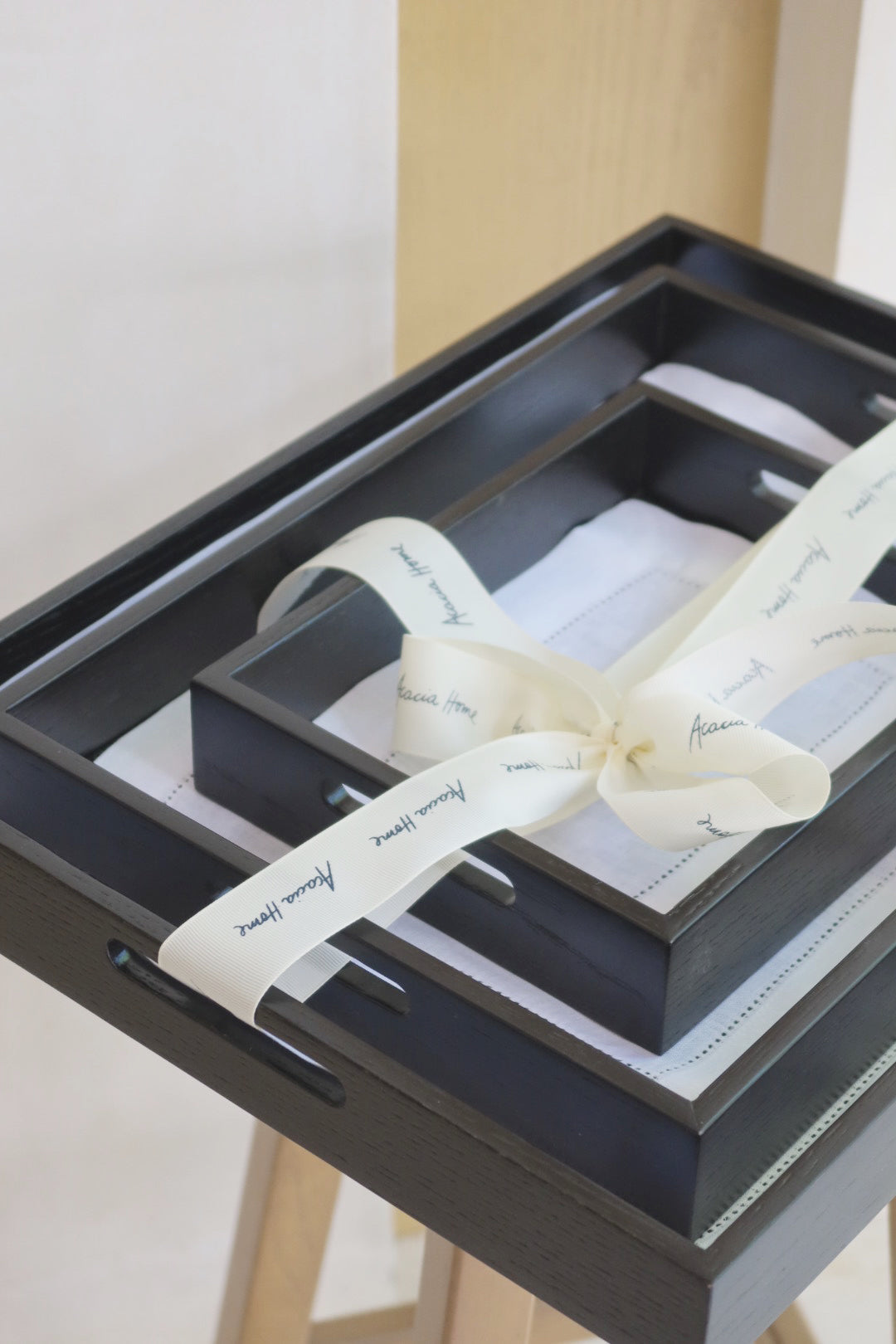 Set de 3 bandejas de servir o multiusos cedro con tapetito personalizado 100% lino.